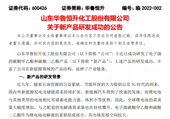 華魯恒升發(fā)布公告稱,公司于近日成功研發(fā)了電子級(jí)的碳酸甲乙酯和碳酸二乙酯產(chǎn)品(“新產(chǎn)品”),上述產(chǎn)品的研發(fā)成功,豐富了公司在新能源領(lǐng)域的產(chǎn)品結(jié)構(gòu),延伸了產(chǎn)業(yè)鏈條。